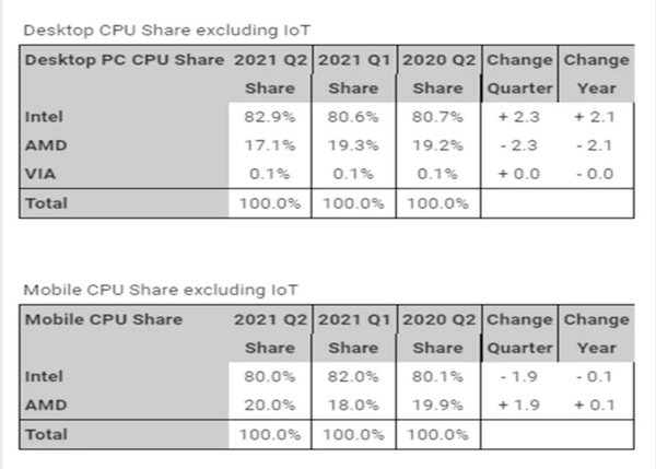 Các số liệu của Mercury Research là số liệu của toàn bộ thị trường x86, bao gồm CPU PC và cả CPU laptop, chip máy chủ và silicon x86 custom dành cho các sản phẩm như PlayStation 5 và Xbox Series X / S. Thật thú vị, thị phần của AMD ở bộ vị xử lý PC x86 (không bao gồm danh mục IoT) thực sự đã giảm liên tục, giảm từ 19,3% trong quý 1 của năm nay xuống còn 17,1% trong quý 2.