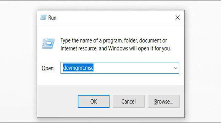 - Vào Start => Chọn Device Manager => Bấm tổ hợp phím Windows + R => Điền mã lệnh devmgmt.msc => OK