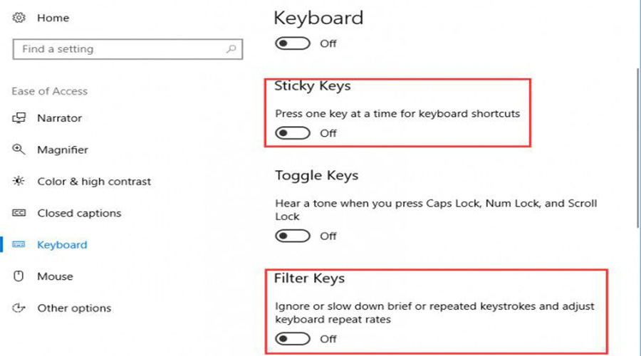 - Tiếp theo, nếu bạn đang sử dụng Windows 10, thì vào Settings => Ease of Access. Sau đó cuộn xuống Keyboard rồi tắt Sticky Keys và Filter Keys.