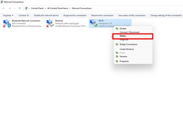Bước 3: Click chuột phải vào WiFi đang kết nối => Status