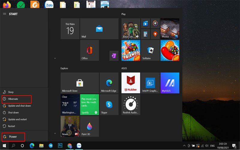 Sau khi thực hiện xong các bước bạn có thể thấy tính năng Hibernate nằm ở biểu tượng nút nguồn chung với các tính năng khác.