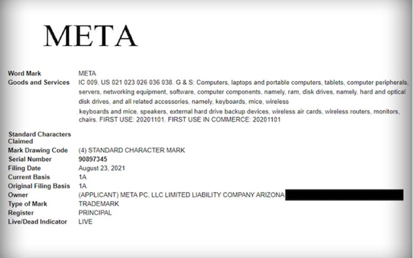 Vào cuối tháng 10, sau khi Mark Zuckerberg quyết định thay đổi công ty tên từ Facebook sang Meta để phù hợp với trọng tâm phát triển kinh doanh trong tương lai, thì mới biết cái tên này đã có công ty khác đặt trước rồi. Là một công ty có trụ sở tại Arizona chuyên bán máy tính, máy tính bảng và phần mềm công nghệ được gọi là Meta PC và càng không thể hơn là họ vừa đăng ký chủ sở hữu tên doanh nghiệp vào tháng 8 vừa qua.