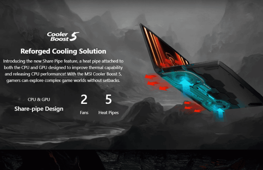 - Một trong những yếu tố then chốt giúp MSI Katana duy trì hiệu suất ổn định trong suốt quá trình sử dụng chính là hệ thống tản nhiệt Cooler Boost 5 - công nghệ độc quyền đến từ MSI. Hệ thống này trang bị 2 quạt công suất lớn và 5 ống dẫn nhiệt, nổi bật với thiết kế Share Pipe mới, trong đó một ống dẫn nhiệt đặc biệt được gắn chung cho cả CPU và GPU. Cơ chế tản nhiệt chia sẻ giúp luồng nhiệt được phân phối đều và hiệu quả hơn, từ đó giải phóng tối đa hiệu suất CPU, đồng thời giữ cho toàn hệ thống hoạt động ở mức nhiệt lý tưởng ngay cả khi xử lý các tác vụ nặng như chơi game AAA hay dựng hình 3D.
