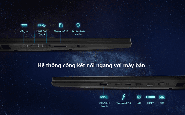 - MSI GT77 có một bộ cổng giao tiếp đa dạng và đầy đủ, đáp ứng tối đa nhu cầu kết nối của người dùng. Từ cổng DC-in để sạc pin, USB 3.2 và SD Reader Card cho việc truyền dữ liệu và sao lưu dữ liệu, đến Jack Audio™ 3.5mm để kết nối tai nghe hoặc loa ngoài, tất cả được tập trung tại cạnh trái của máy. Cạnh phải của máy được trang bị cổng Killer LAN RJ45 Gigabit cho kết nối mạng ổn định, HDMI và MiniDisplayPort cho việc kết nối với màn hình ngoại vi hoặc TV, cổng TypeC hỗ trợ ThunderBolt™4 và DisplayPort cho kết nối với các thiết bị và màn hình hỗ trợ công nghệ này, và thêm một cổng USB 3.2 nữa để kết nối với các thiết bị ngoại vi khác.