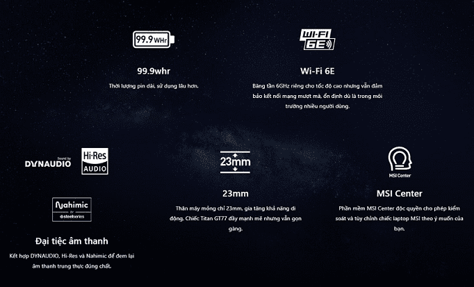 - Với hệ thống loa 4 loa cùng với công nghệ DYNAUDIO™, MSI GT77 đem đến trải nghiệm âm thanh sống động và chất lượng cao, giúp tái hiện âm thanh chi tiết và trong trẻo hơn. Điều này cực kỳ quan trọng cho những người dùng yêu thích giải trí, trải nghiệm âm nhạc, xem phim và chơi game, giúp họ tận hưởng một không gian âm thanh tốt nhất.