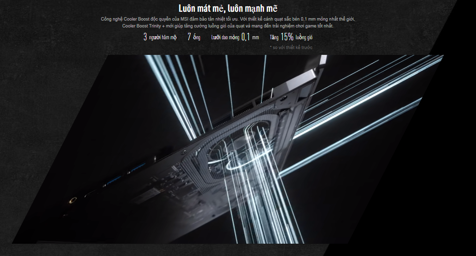 Nhờ công nghệ Cooler Boost độc quyền của MSI đảm bảo cho máy luôn được tản nhiệt tối ưu. Với thiết kế cánh quạt sắc bén 0.1mm mỏng nhất thế giới cùng Cooler Boost Trinity giúp tăng cường luồng gió của quạt, mang đến trải nghiệm chơi game tốt nhất.