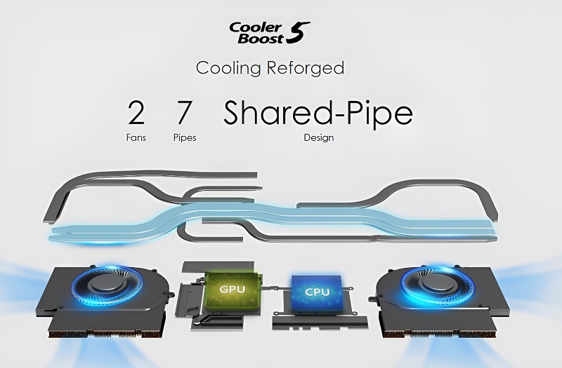 - MSI Creator 16 AI được trang bị hệ thống làm mát Cooler Boost 5, với thiết kế mới Shared-Pipe nhằm cải thiện hiệu suất tản nhiệt hiệu quả dưới tải nặng. Công nghệ Shared-Pipe sử dụng ống đồng kết nối trực tiếp với cả CPU và GPU, giúp tối ưu hóa khả năng dẫn nhiệt và duy trì hiệu suất ổn định trong suốt quá trình sử dụng.