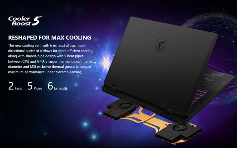 - Được áp dụng công nghệ Cooler Boost 5, laptop được trang bị 2 quạt, giúp duy trì luồng không khí lưu thông ổn định và giảm nhiệt độ nhanh chóng, đảm bảo hiệu suất tối đa khi chơi game hoặc xử lý công việc đồ họa. Với 5 ống dẫn nhiệt, MSI Pulse 17 AI tối ưu hóa khả năng dẫn nhiệt giữa CPU và GPU, giảm thiểu nhiệt độ tích tụ và nâng cao hiệu quả làm mát tổng thể.