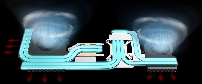 Công nghệ Cooler Boost 5 mô đun kép sử dụng 2 quạt Whirlwind Blade với độ mỏng của quạt được ví như những lưỡi dao, và có tới 6 ống dẫn nhiệt và 4 luồng khí được thoát ra liên tục qua các ống xả khiến nhiệt độ luôn được giữ ở mức ổn định giúp giữ được độ bền bỉ cũng như công suất làm việc cho máy. Thiết kế đã giúp MSI Thin GF65 có được mức công suất tốt hơn tới 20% mang lại nhiệt độ được duy trì “bền vững”.