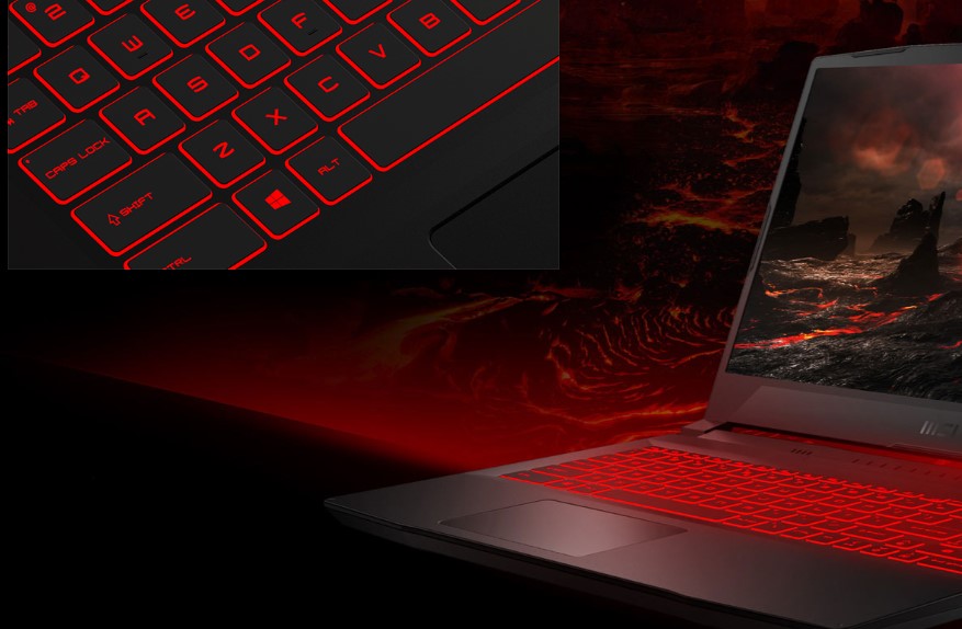 - TouchPad được thiết kế lệch sang bên trái, tạo không gian nghỉ tay rộng hơn. Mặc dù thao tác với TouchPad có chút rít tay, nhưng tốc độ phản hồi nhanh và nhạy. Bàn phím còn được trang bị đèn RGB LED (hoặc LED nền đỏ - tuỳ phiên bản) rực rỡ mang đậm chất gaming của MSI, giúp sử dụng dễ dàng trong điều kiện thiếu sáng và tạo màu sắc bắt mắt, mạnh mẽ cho máy tính của bạn. Thiết kế bàn phím đẳng cấp này thể hiện rõ sự chăm sóc và tập trung vào trải nghiệm người dùng của dòng laptop MSI GF66.