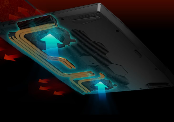 - Hệ thống tản nhiệt CoolerBoost 5 (2 quạt & 6 ống đồng) đảm bảo máy luôn mát mẻ sau nhiều giờ hoạt động.