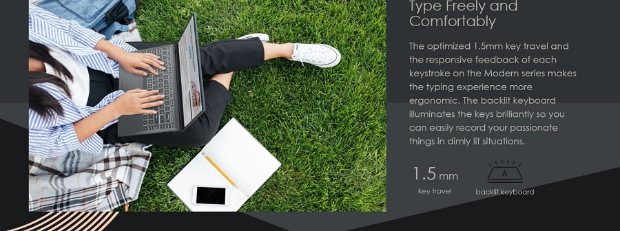 Modern 14 b11mo được chế tạo trong khung nhôm nguyên khối chỉ với 16,9-18,1 mm siêu nhẹ và siêu mỏng chỉ nặng 1,3kg, chiếc laptop này hoàn toàn phù hợp với công việc có tính chất di chuyển cao. Dù bạn đi đến đâu, cũng rất tiện lợi mang theo, giúp bạn dễ dàng bắt kịp mọi vấn đề trong cuộc sống.