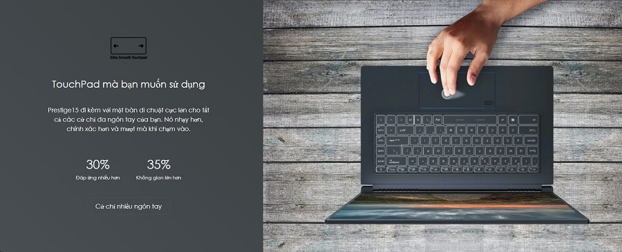 Msi prestige 14 a11 có touchpad cực lớn, lớn hơn 35% mẫu touchpad thông thường, và có khả năng phản hồi nhanh hơn 30%. Từ đó bạn có thể thao tác dùng nhiều ngón tay hoạt động cùng lúc trên bề mặt