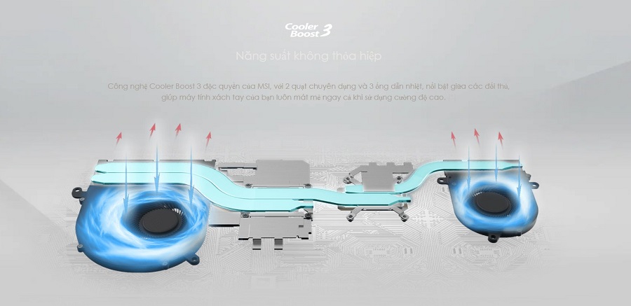 Msi prestige 14 làm việc cả ngày dài mà không lo bị gián đoạn vì máy quá nóng nhờ công nghệ Cooler Boost 3 độc quyền của MSI. Nó được thiết kế với 2 quạt chuyên dụng và 3 ống dẫn nhiệt, hoàn toàn nổi bật so với các đối thủ khác. Như vậy máy tính của bạn sẽ luôn được mát mẻ ngay cả khi sử dụng liên tục với cường độ cao.