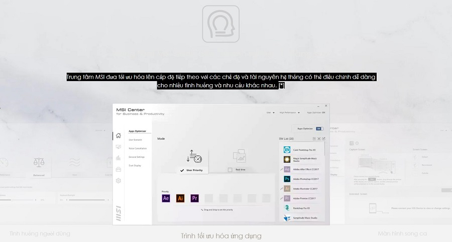 Đặc biệt ở MSI chính là có một trung tâm dành riêng cho các sản phẩm của MSI. Ở đây bạn có thể tùy chỉnh tối ưu hóa các chế độ hiển thị hoặc cấu hình tùy theo nhu cầu của mình.