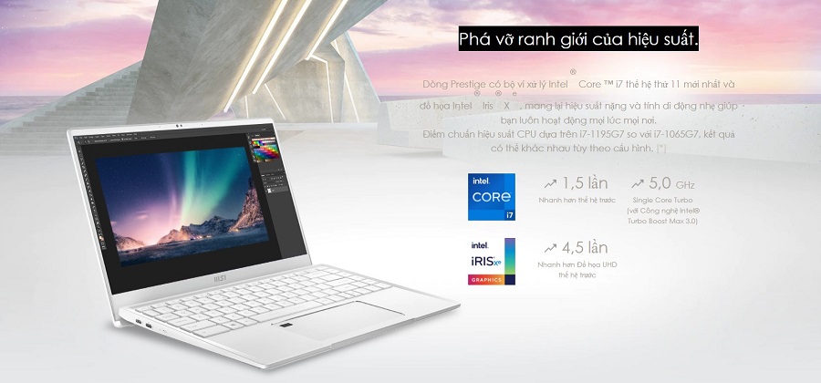 Laptop msi prestige 14 được trang bị bộ vi xử lý Intel Core i7-1185G7 thế hệ thứ 11 mới nhất nhanh gấp 1,5 lần so với thế hệ thứ 10 và tốc độ xử lý lên đến 5.0GHz. Đồng thời có đồ họa Intel Iris Xe vượt trội hơn 4,5 lần đồ họa UHD tiền nhiệm. Với hai cấu hình trên sẽ mang lại một chiếc laptop có hiệu năng mạnh mẽ kết hợp với tính di dộng cao giúp người dùng có thể luôn mang theo bên mình để làm việc và giải trí mọi lúc mọi nơi.