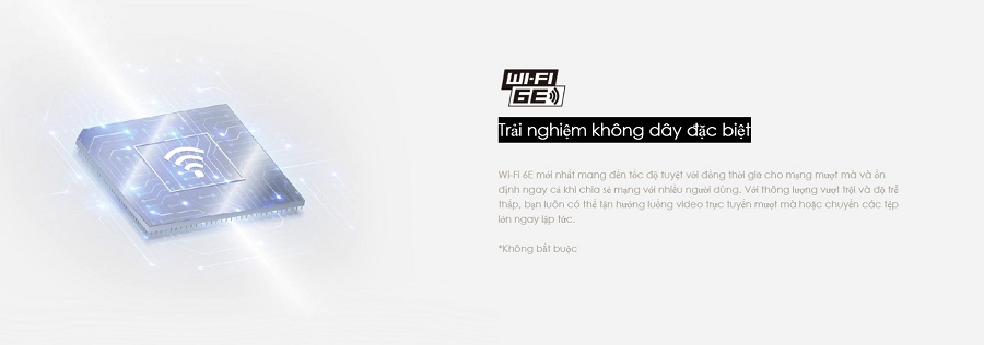 - Wi-Fi 6E mới nhất mang đến tốc độ tuyệt vời đồng thời giữ cho mạng mượt mà và ổn định ngay cả khi chia sẻ mạng với nhiều người dùng. Với thông lượng vượt trội và độ trễ thấp, bạn luôn có thể tận hưởng luồng video trực tuyến mượt mà hoặc chuyển các tệp lớn ngay lập tức.