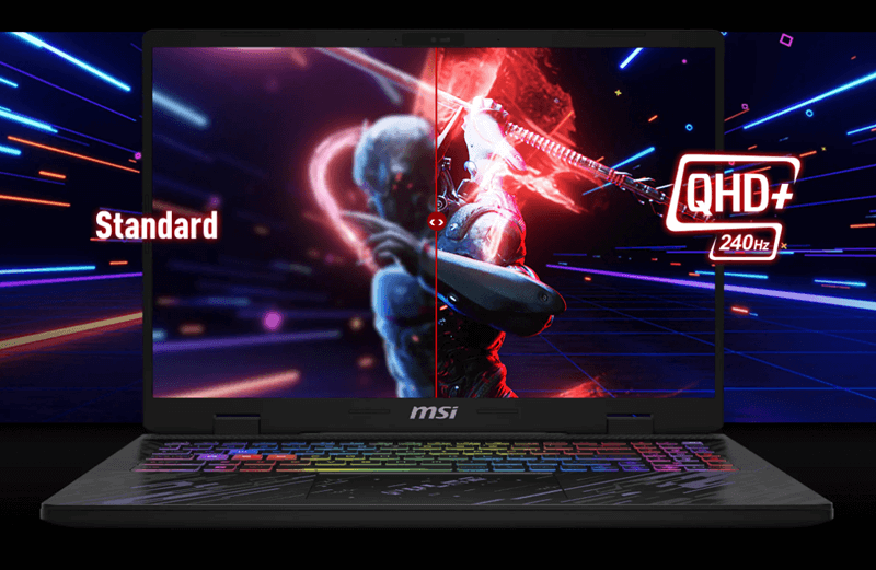 - Pulse 16 AI được trang bị màn hình kích thước 16.0-inch QHD (2560*1440) pixel cho hình ảnh sắc nét và chi tiết hơn so với FHD (1920*1080) pixel kèm với đó là tấm nền IPS cho góc nhìn rộng, không bị méo hay biến dạng khi nhìn từ các góc khác nhau. Ngoài ra MSI còn trang bị thêm cho chiếc máy này độ phủ màu 100% DCI-P3 cho dải màu rộng hơn, tái hiện màu sắc sống động và chân thực hơn, phù hợp cho việc làm đồ họa và chơi game chuyên nghiệp. Tần số quét 240Hz cho hình ảnh trơn mượt hơn, giảm hiện tượng xé hình và trễ hình khi chơi game nhanh và đòi hỏi phản ứng cao. Với thiết kế hiện đại và viền mỏng, màn hình giúp tạo ra không gian trải nghiệm rộng rãi hơn, đồng thời khả năng chống chói cũng đảm bảo bạn có thể làm việc hoặc giải trí mà không gặp khó khăn từ ánh sáng môi trường.