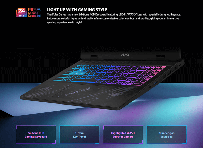 - Dòng Pulse có Keyboard RGB 24 vùng mới có các phím "WASD" được chiếu sáng bằng đèn LED Neon với các keycap được thiết kế đặc biệt, tạo nên một vẻ ngoại hình đầy tinh tế. Với hành trình phím chỉ 1.7mm cho phép thao tác nhấn phím nhẹ nhàng với khả năng tăng tốc độ gõ phím, giúp các game thủ chiến các tựa game yêu cầu sử dụng skills liên tục cực nhanh và nhạy. Điểm cộng tại phần bàn phím có trang bị thêm NumberPad giúp người dùng có thói quen nhấn dãy phím số bên phải sẽ dễ thao tác hơn, ngoài ra ở một số tựa game như GTA V,...dãy phím số này sẽ giúp người dùng trải nghiệm được trọn vẹn hơn về các tính năng.