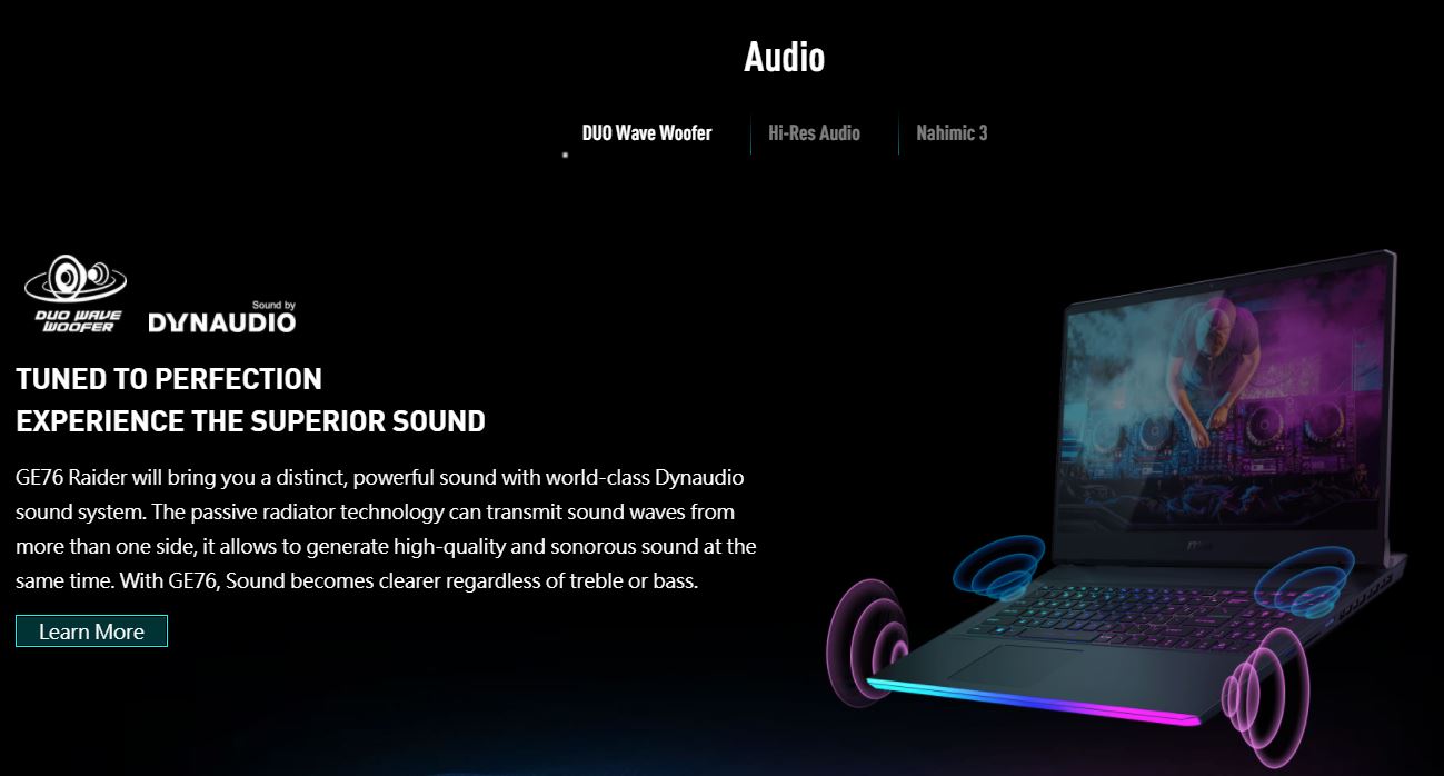 MSI GE76 10UH mang đến âm thanh sống động như bạn đang ở trong rạp chiếu phim. Nhờ vào âm thanh vượt trội của âm nhạc lossless, những âm thanh từ máy phát ra đều là những âm thanh với độ phân giải cao. Công nghệ bộ tản nhiệt thụ động tạo ra âm trầm mạnh mẽ và âm thanh rõ ràng, sắc nét giúp có cảm giác thính giác đạt đỉnh cao.