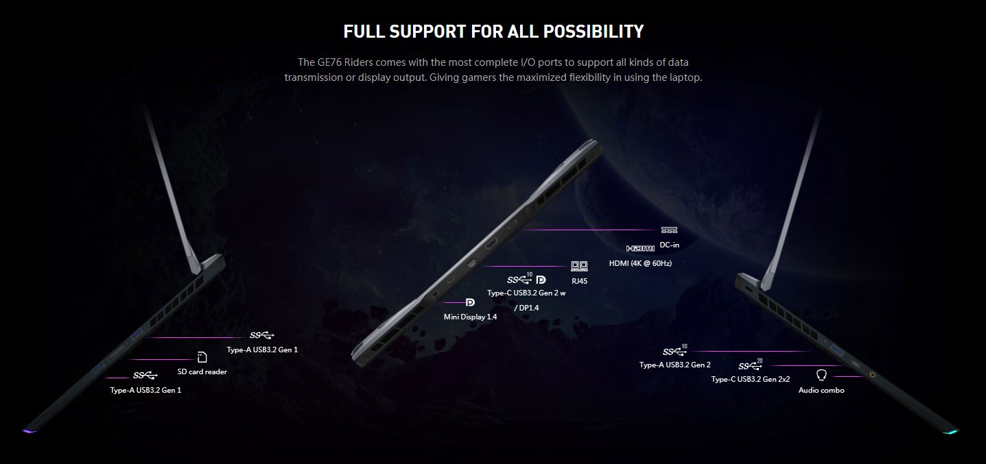 - MSI GE76 10UH có cho mình tất cả cổng kết nối hiện đại và hợp thời nhất như: 1 x HDMI, 1 x Mini Display Port, 1 x USB Type-C, 2 x USB 3.1, 1 x Jack Audio™, 1 x MicroSD Reader, 1 x Killer LAN RJ45 Gigabit, 1 x Webcam, 1 x Hi-Res Audio™ with Nahimic 3 Audio™, 1 x Giant Speaker with 2 Speaker, 1 x Steelseries Engine 3, 1 x CoolerBoost 5 (2 Fans with 7 heat pipes), 1 x True Color, 1 x Logo Le.