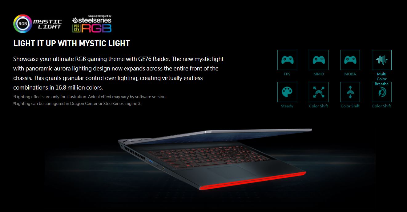 - Với 16,8 triệu màu, viền thân máy MSI GE76 có thể phát ra những ánh sáng rất đẹp mắt, đầy thần bí. Đối với những người yêu thích sự mới lạ và sáng tạo thì đây chính là một ưu điểm rất lớn của máy. Tuy vậy, nếu không thích thì hoàn toàn có thể tắt nó đi. Thiết kế chiếu ánh sáng cực quang toàn cảnh này của MSI GE76 10UH giờ đây đã mở rộng ra toàn bộ mặt trước của khung máy.