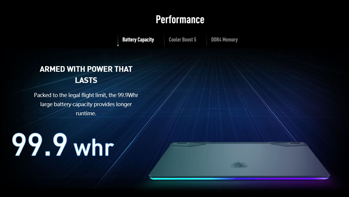 Nói đến hiệu năng, có thể dùng từ hoàn hảo để nói về MSI GE76. Hầu như không có điểm nào để chê về cấu hình máy, mọi thông số đều cho thấy đây là mẫu laptop có thể cân mọi tựa game, mọi phần mềm, ứng dụng nặng nhất. Máy trang bị Intel® i9 Gen 10th, RAM DDR 3200MHz, ổ cứng SSD M.2 PCIe + HDD 5400rpm giúp tốc độ phản hồi cực nhanh. Mọi tác vụ đều được thực hiện một cách nhanh chóng, mượt mà với GE66. Tận dụng hiệu suất mạnh mẽ từ laptop MSI GE76 10UH cùng sự hỗ trợ của bộ nhớ DDR4 3200 mới nhất để tận hưởng tốc độ hệ thống cùng khả năng phản hồi nhanh hơn, đưa trải nghiệm chơi game lên 1 tầm cao mới. So với thế hệ trước, hiệu suất của máy đã tăng lên đến 50%.