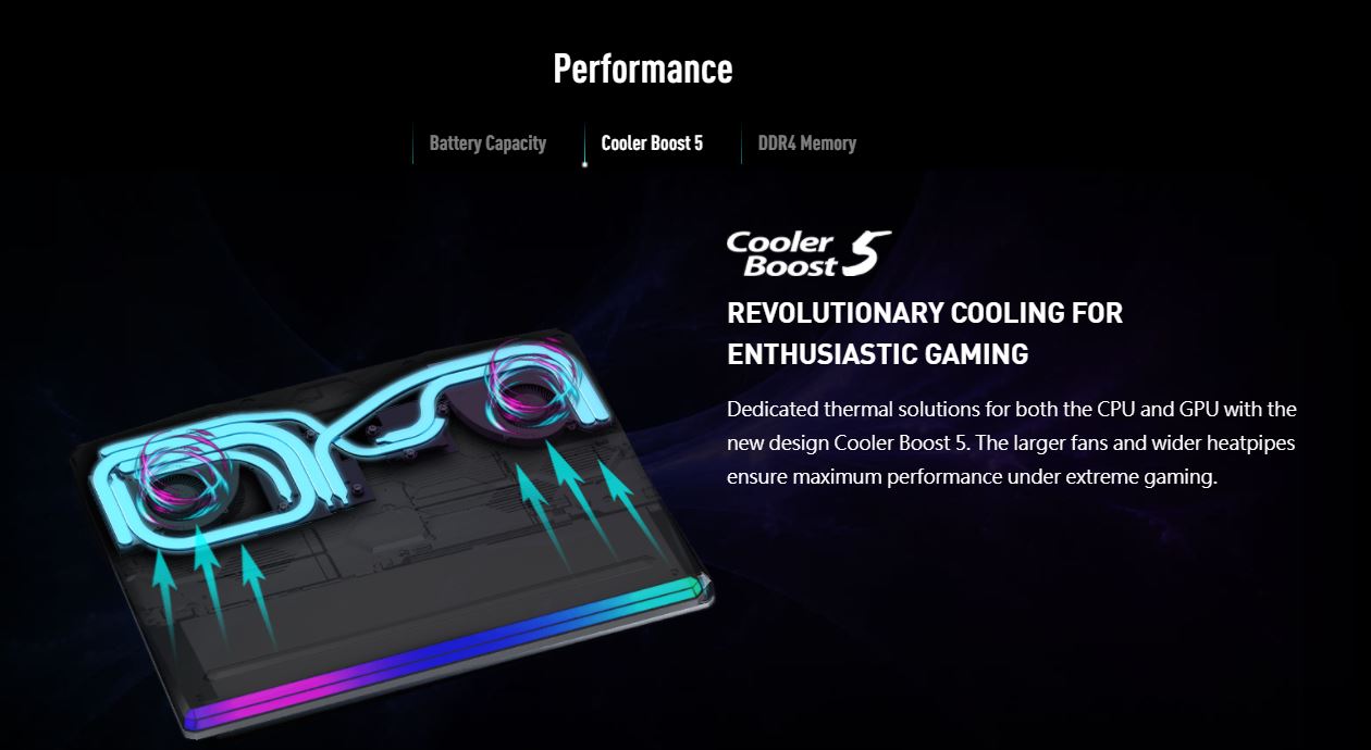 Sử dụng thiết kế mới của Cooler Boost 5 với tổng cộng 8 ống dẫn nhiệt, đây là các giải pháp tản nhiệt chuyên dụng dành cho cả CPU và GPU. Nhờ vào điều này và quạt lớn, ống dẫn nhiệt rộng đã đảm bảo hiệu suất tối đa khi người dùng chơi game trong nhiều giờ liền. Máy sẽ không xảy ra tình trạng quá tải nhiệt và luôn vận hành êm ái, không gây ra tiếng động ồn ào.