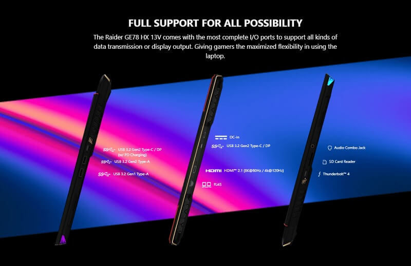MSI Raider GE78 HX 13VI được trang bị các cổng I/O đầy đủ nhất, đáp ứng tối đa mọi nhu cầu của người dùng trong việc truyền dữ liệu hay hiển thị đầu ra. Điều này mang đến cho game thủ sự linh hoạt tối đa trong việc kết nối và sử dụng các thiết bị ngoại vi: