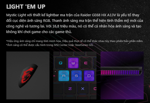 3. THIẾT KẾ ĐỘC ĐÁO ĐẬM CHẤT GAMING- MSI Raider GE68 đươc thiết kế vô cùng độc đáo bởi Mystic Light với lightbar ma trận 16,8 triệu màu vô cùng độc đáo dọc thân máy. Bên cạnh đó, chiếc GE68 được lấy cảm hứng từ việc khám phá hố đen Sagittarius S, với công nghệ tiên tiến kết hợp tính thẩm mỹ cao của ma trận ánh sáng nói trên, GE68 sẽ thu hút mọi ánh nhìn ngay lập tức khi xuất hiện. |